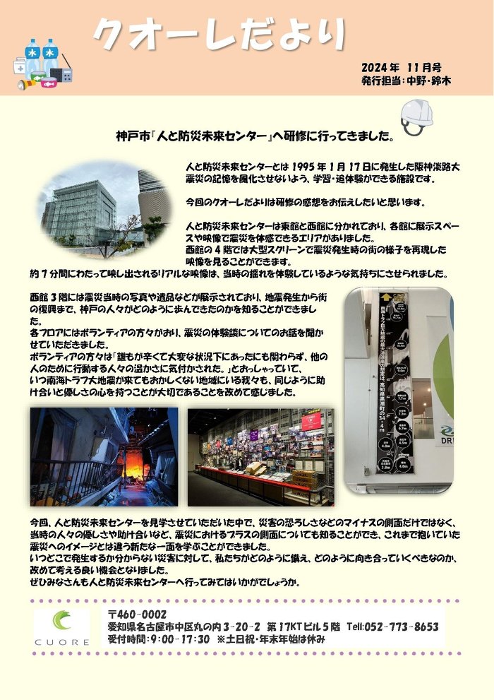 クオーレだより 11月号を発行いたしました。 今回は、『人と防災未来センター』へ訪れた研修についてです。 阪神淡路大震災について映像や展示品、写真などを通じて学んできました。 ぜひご一読ください。