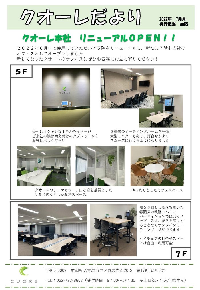 2022年7月19日(月)より、弊社は本社オフィスのフロアを同ビル7階に増床する運びとなりました。 オフィス増床に伴う会社の住所や電話番号等の変更はございません。 5階と7階の2か所体制で運営しております。 ご来社の際は、これまで通り5階までお越しくださいませ。 また、クオーレだより7月号にて、新しいオフィスについて取り上げております。ぜひご覧ください。 今後とも、ご愛顧の程よろしくお願いいたします。